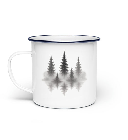 Dieser Emaille Becher mit Nebelwald-Design ist für Mystiker und Outdoor-Fans. Perfekt für Herbst Camping.