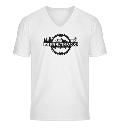 Wortspiel für Velo-Fans. 'Selten radlos' – weil man ohne Rad einfach nicht komplett ist. Ein witziges Fahrrad T-Shirt mit V-Ausschnitt.