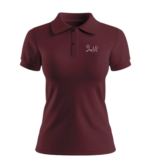 Wein und Berge als Stick. Genuss zum Anziehen. Ein Wein Poloshirt Damen für schöne Abende.
